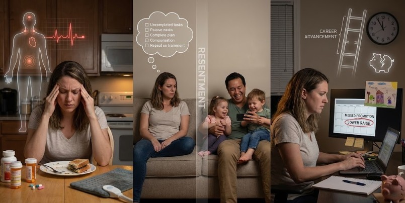 Over time, this creates real economic consequences. Lower raises, missed promotions, and reduced retirement savings. The unpaid mental labor you do at home has a price—your own financial security and professional growth. The motherhood penalty is real and largely driven by invisible labor that keeps women from fully engaging in careers.